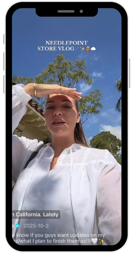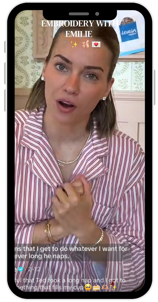Emilie's current content leans into slow, intentional living. Between needlepointing, embroidery, and thrifting hauls, she's tapped into the "grandma hobbies" trend in a way that feels completely natural to her brand.